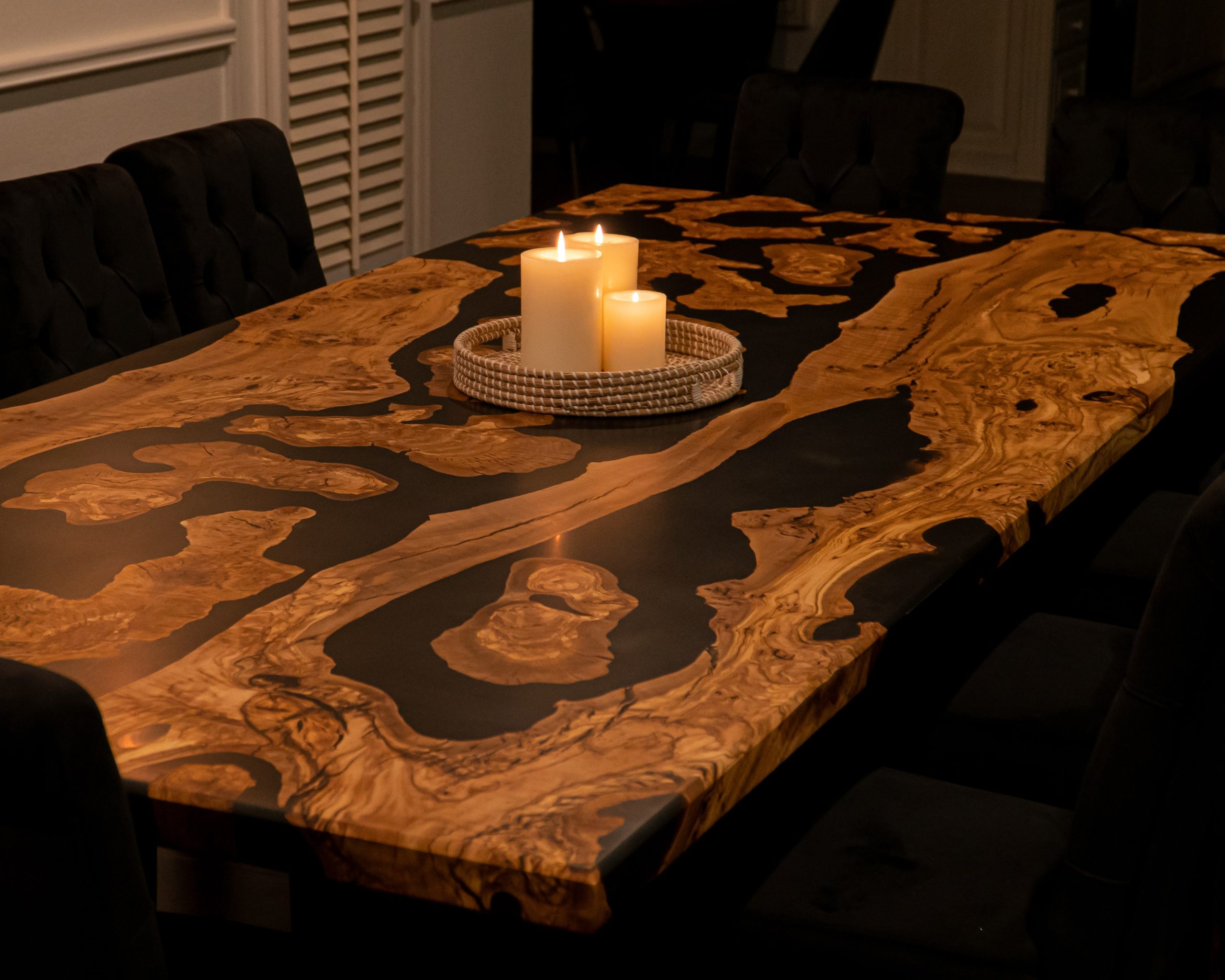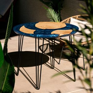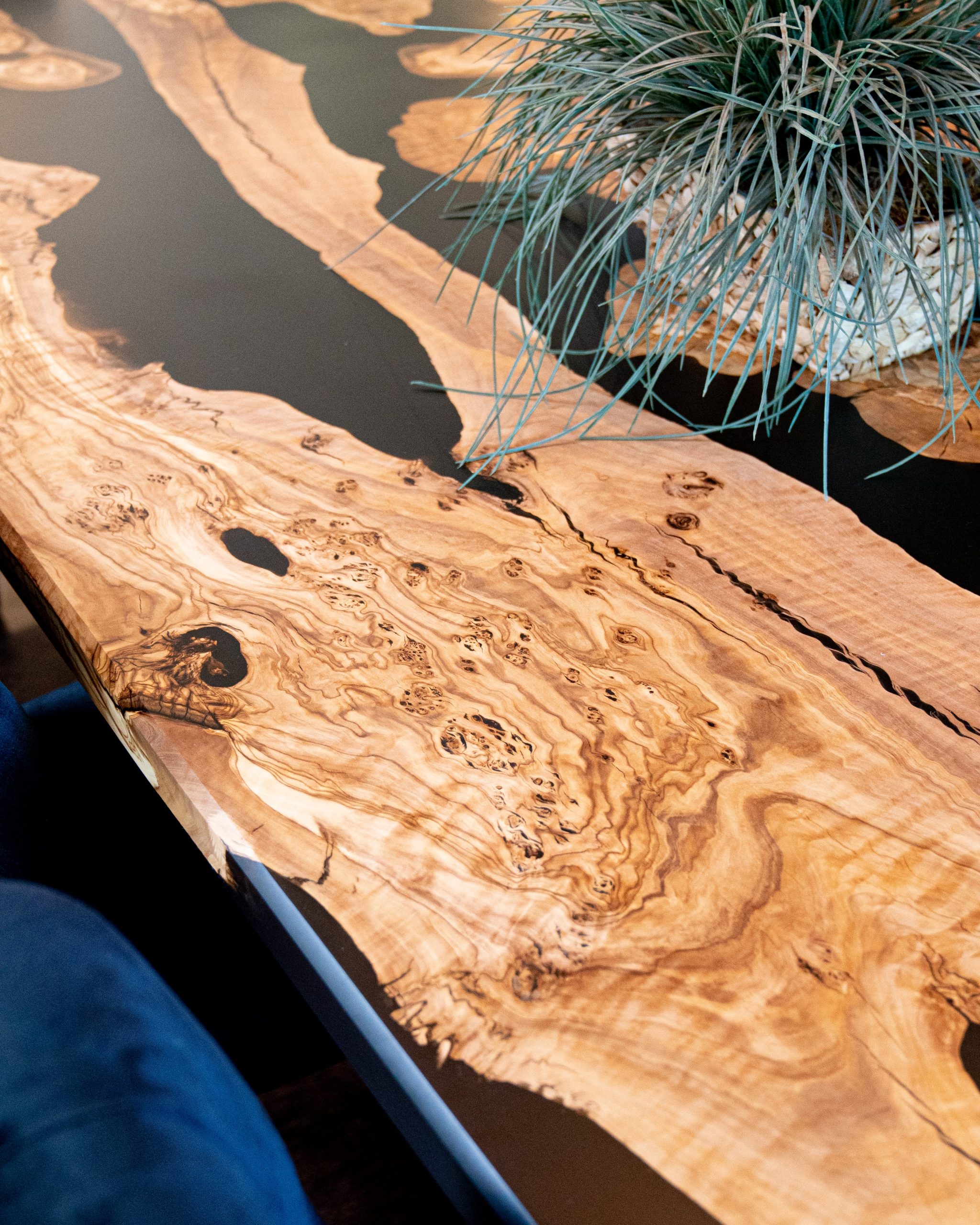 “The Tiger” is a coffee table that combines the elegance and natural character of the Acacia wood from which it is handcrafted with the gracefully woven, dark stripes of the flowing epoxy. At 18” in height, this sophisticated coffee table will be the central feature in any living room, bedroom, or office setting.